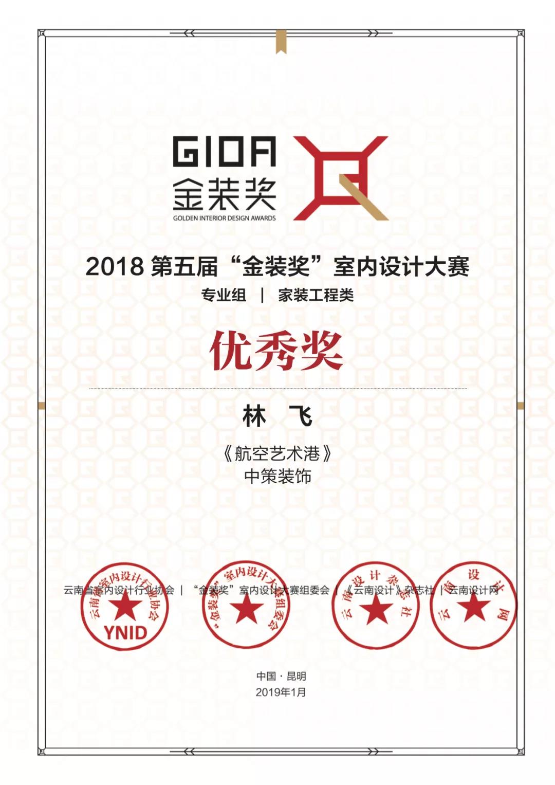 2019年1月9日,2018第五届“金装奖”室内设计大赛颁奖盛典在昆明世博园中国馆盛大举行,昆明中策