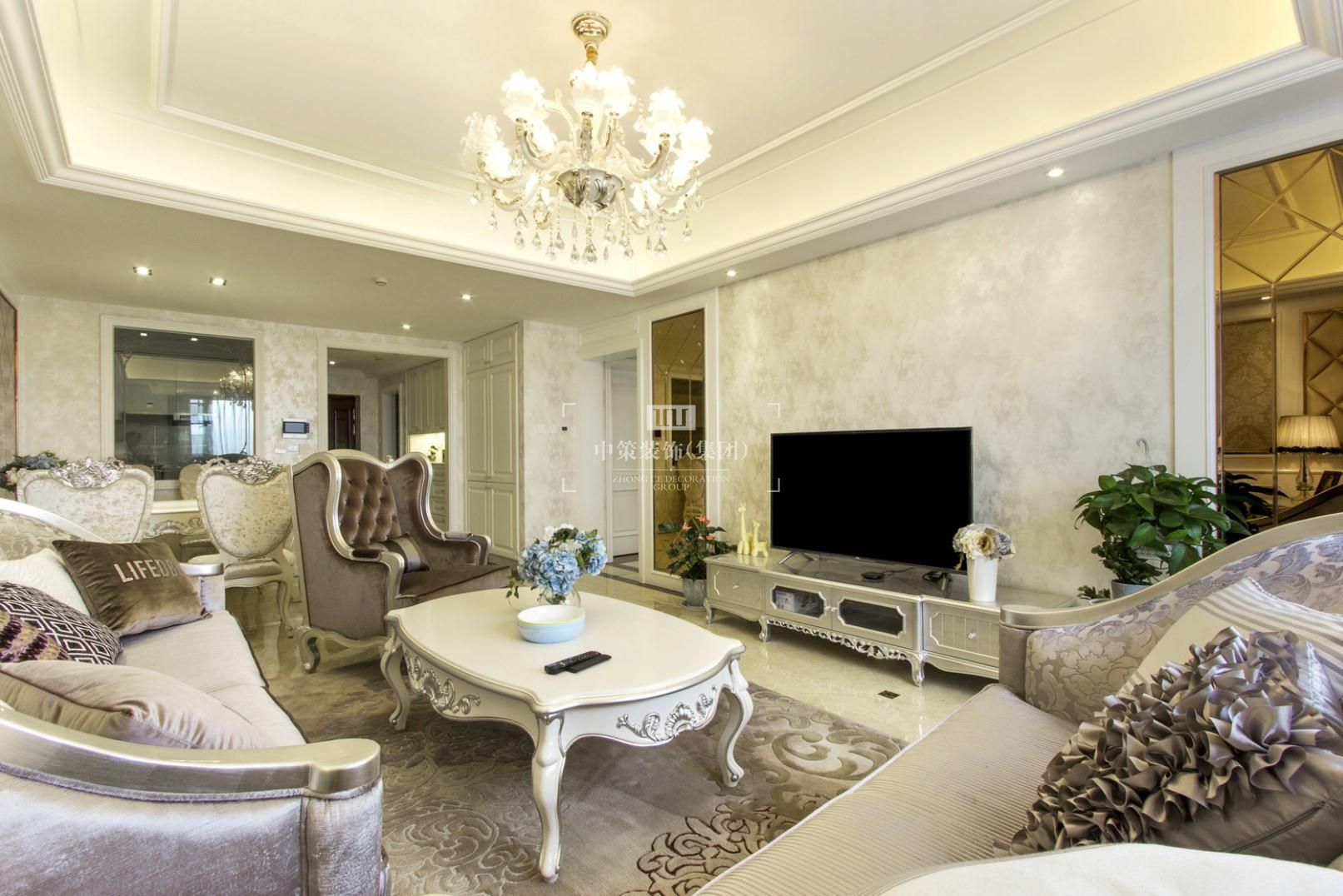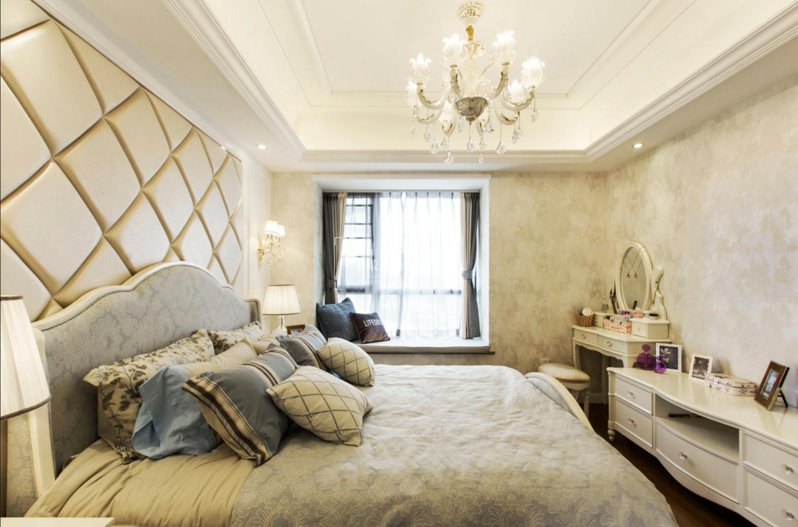本案设计的主题是新古典,摈弃了巴洛克和洛可可风格所追求的新奇和浮华,建立在一种对古典的新的认识基础上,强调简洁、明晰的线条和优雅、得体有度的装饰。无论是窗帘,沙发还是墙砖总能在不经意间勾起人们的浪漫情怀。