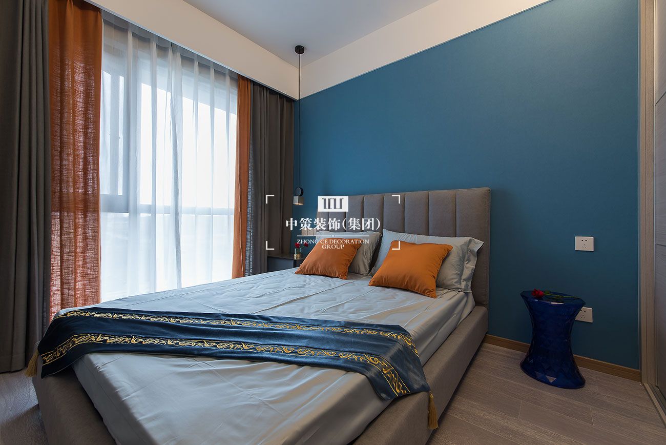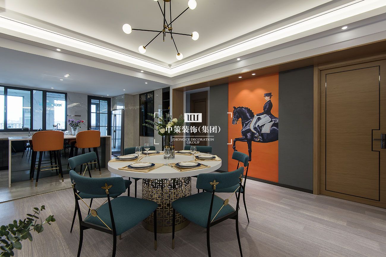 在配饰方面以马为主题,橙色贯穿整个空间。蓝、灰色与与时尚热辣的爱马仕橙搭配,就像是绅士与吉普赛女郎跳起弗拉门戈,诱惑的画面感别具风味。无论是客厅还是卧室与餐厅,这样的经典搭配百看不厌。