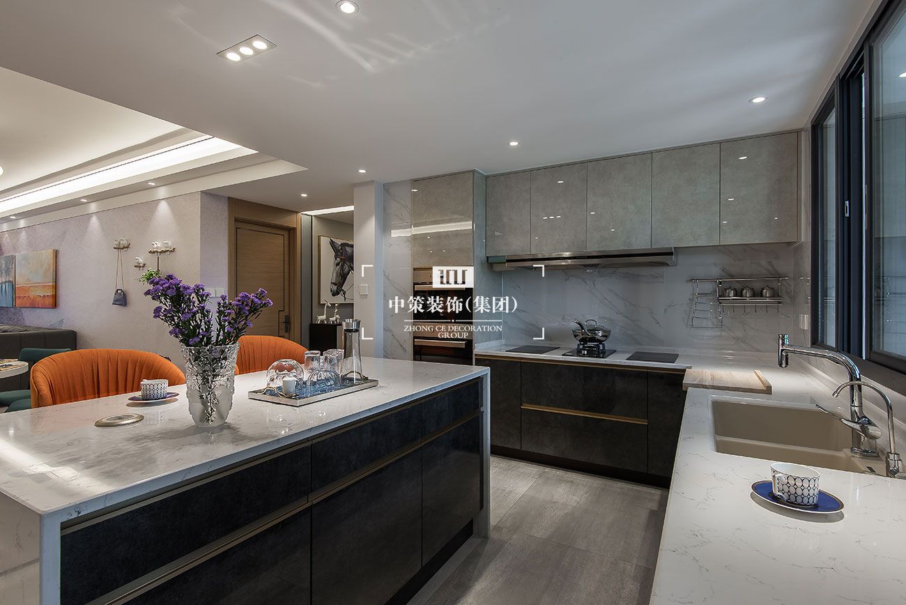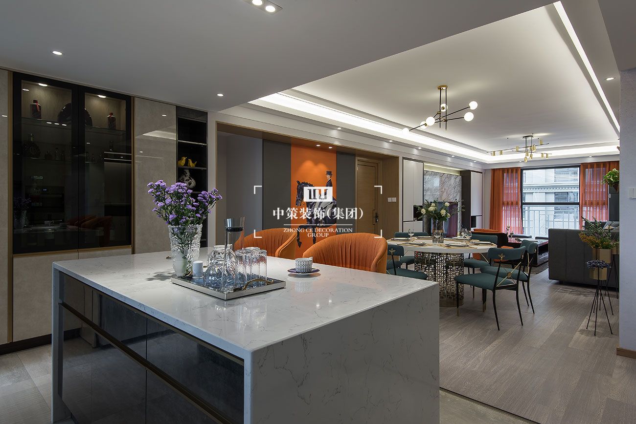 本案以马为主轴,在追求空间美感的同时也具备空间的扩张性,原本封闭的厨房和单独的储物间,通过空间的重新定义,把厨房和储物间合并后做成开放式厨房,同时在厨房里设计储物柜,一举多得,保证储物空间的同时也更加美观;而且还多出来岛台的位置,这样客厅、餐厅和厨房空间重新串联,开阔又有品质感。